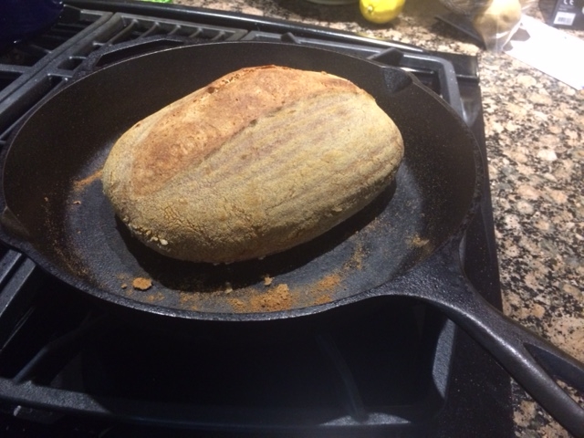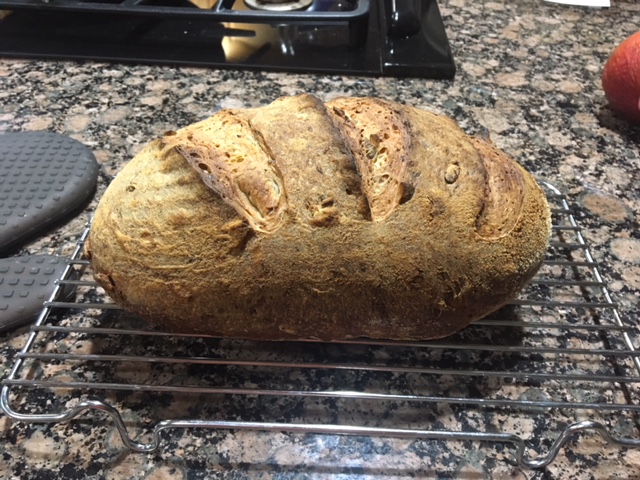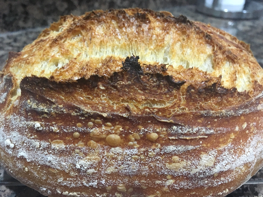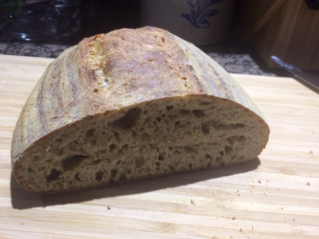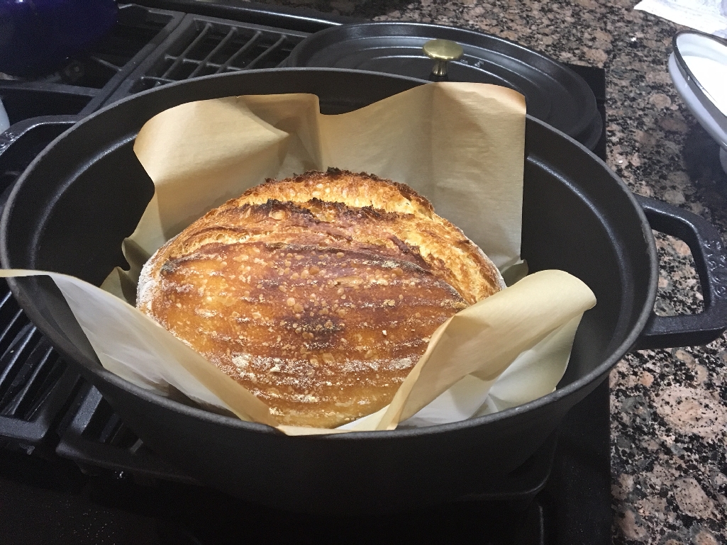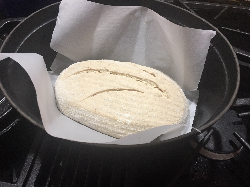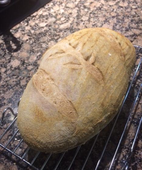 100 g starter 8 g salt 250 g water 284 g bread flour (sifted) 100 g whole wheat flour (sifted) Dough Seems a bit dry, added a bit more water. Used dutch oven - Baked for 30min @ 450 F with lib on - Baked 15min with lid off Starter had 2 feedings, was very active 4 hrs proof, slap and fold four times (every hour), 12 hrs retard, 1 hr rest. Had a good oven spring