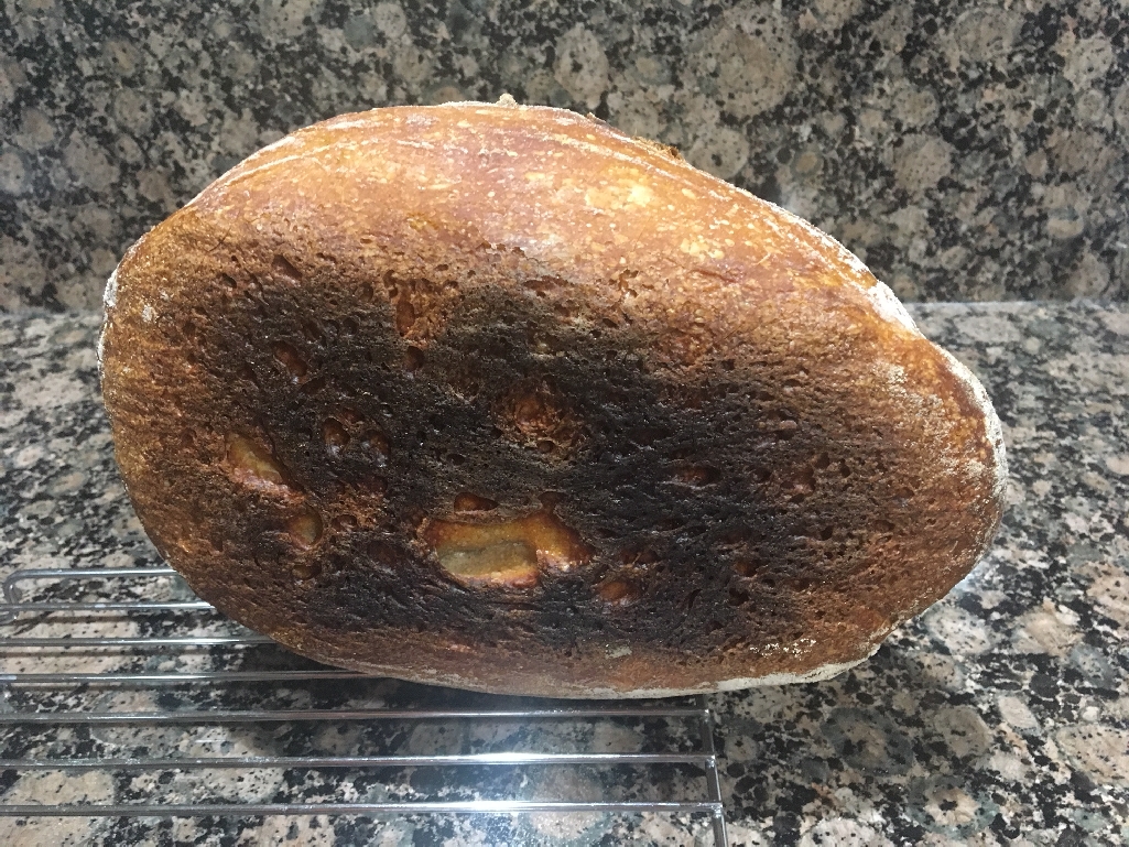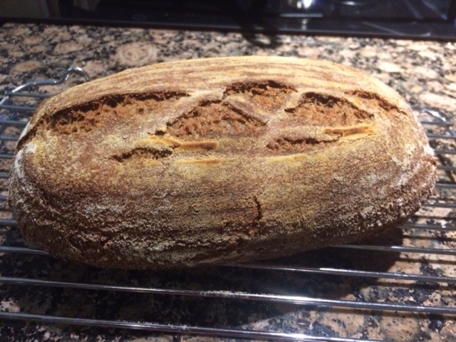 Mixing ratio from Chef John Bulk fermentation in north side of house ~12 hrs. The dough rose above the tops of the banneton, next time use cooler location. Did not use enough rice on inside of banneton Forgot to cut the ear Did not spray surfae of bread with water Did not spray inside of the oven Cooked for 25 minutes at 450 degrees, crust looked done so we removed at 25 min. Denser crumb, was slightly underdone, almost cake like. Need to increase baking time.