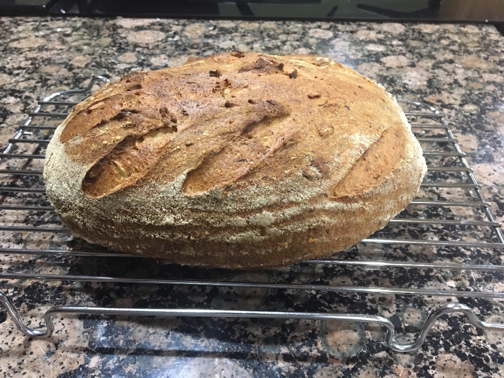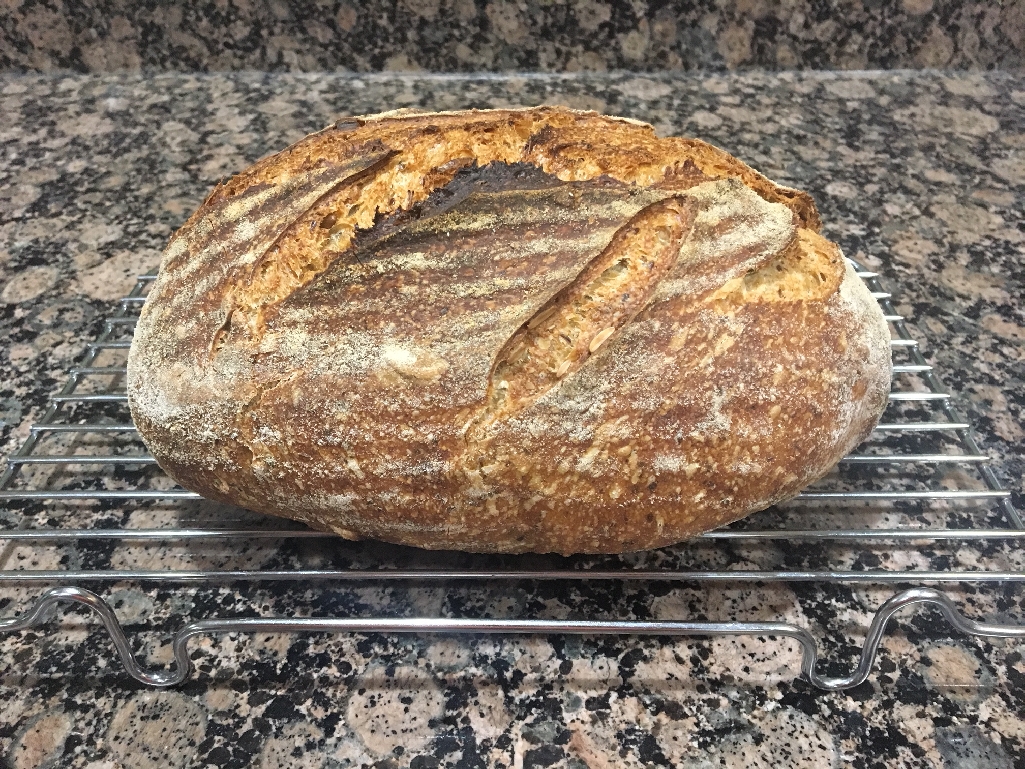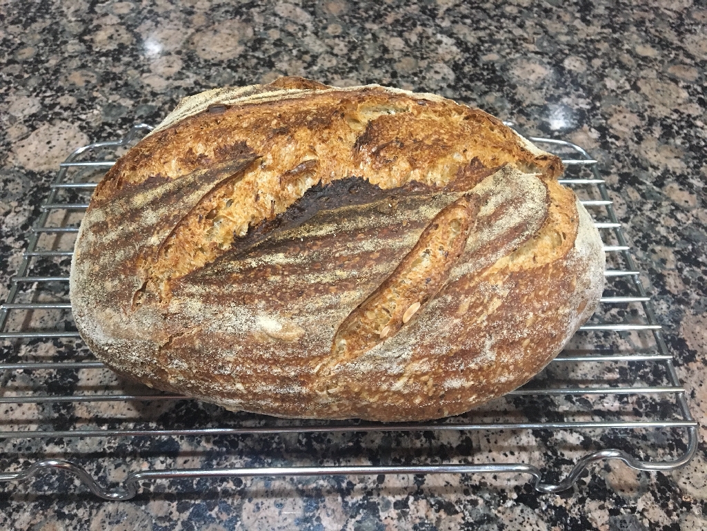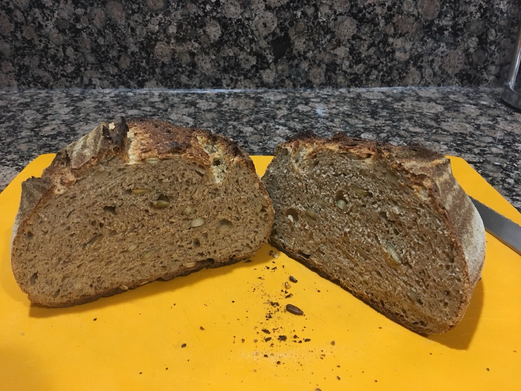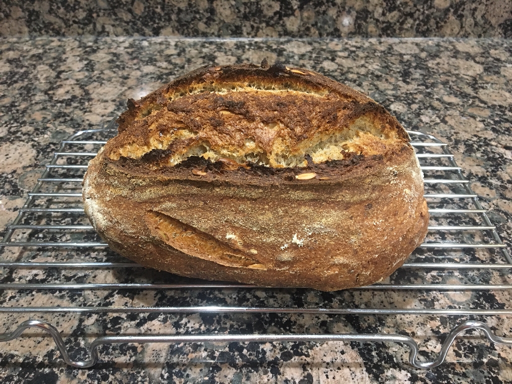 100 g starter 8 g salt 250 g water 394 g bread flour 20 g pumpkin seeds 20 g sunflower seeds 20 9 ground flax seed Baked with convection for 30min @ 450 F