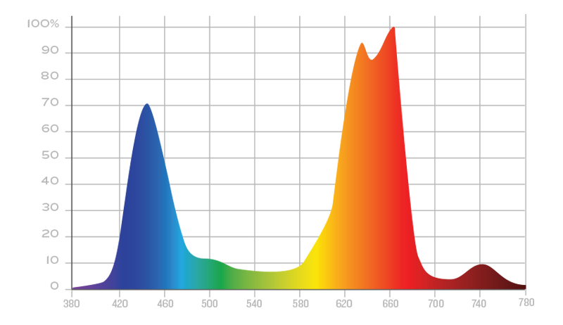 CLW uses their proprietary OptiGrow® Blend which is based on university studies. It features dominant wavelengths at: