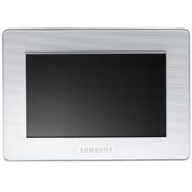 SPF-73V "Samsung steps up from their SPF-72H frame with the Wi-Fi enabled SPF-72V Digital Picture Frame. In addition to accepting JPEG photos from the usual sources: digital camera memory cards, USB flash drives, home computers or USB hard drives, the SPF-72H is capable of Wi-Fi file transmission. Utilizing an 802.11 b/g interface, the frame can connect to a PC computer using Windows Media Player 11. Additionally, the Wi-Fi interface can be configured to connect to a local router for direct connection to the internet for displaying online photo albums."