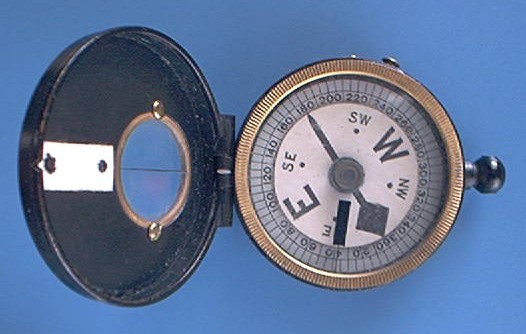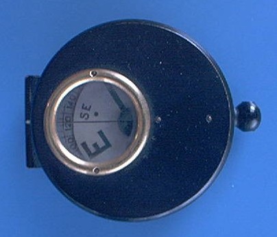 Similar to the "Night Marching" Compass by F. Barker & Son. Utilizes a white compass card with a large arrow for north and a sparse selection of cardinal points, surrounded by a silvered bearing ring - the card is visible through the cover. A movable bearing arrow on the knurled-edge crystal allows you to set a heading and then simply match up north with the pointer. Finer bearing readings were accomplished via the bail (missing, unfortunately) and a hairline in the glass window within the cover. A traveling stop freezes the compass card via a lever at the lower right.